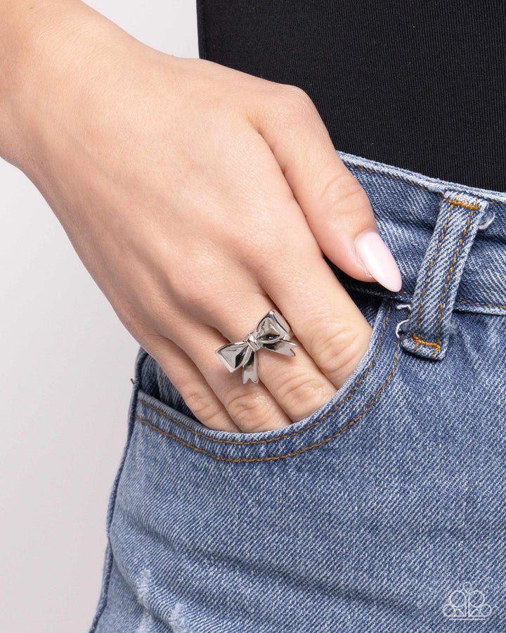 A high-sheen band of silver loops and curls into a delicate bow atop the finger for a radiantly refined centerpiece. Features a dainty stretchy band for a flexible fit.Sold as one individual ring.