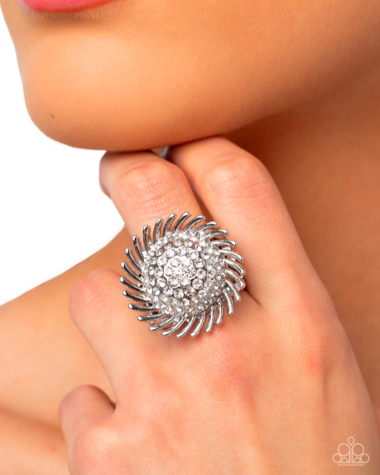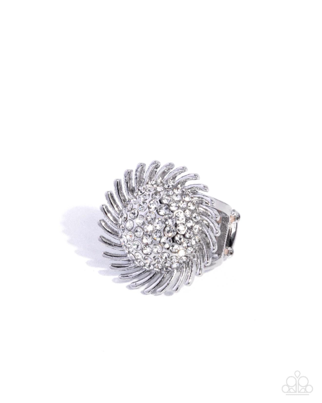 Curled bars of silver whirl out from a white rhinestone-embellished center, creating an exaggerated firework-like display atop the finger. Features a stretchy band for a flexible fit.