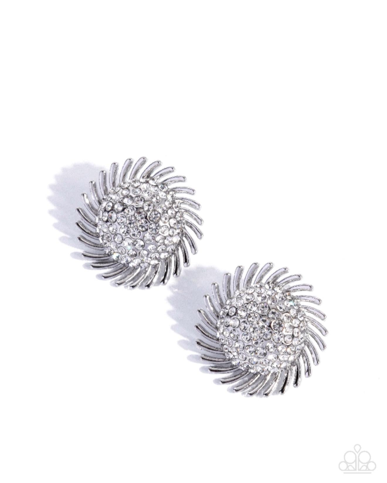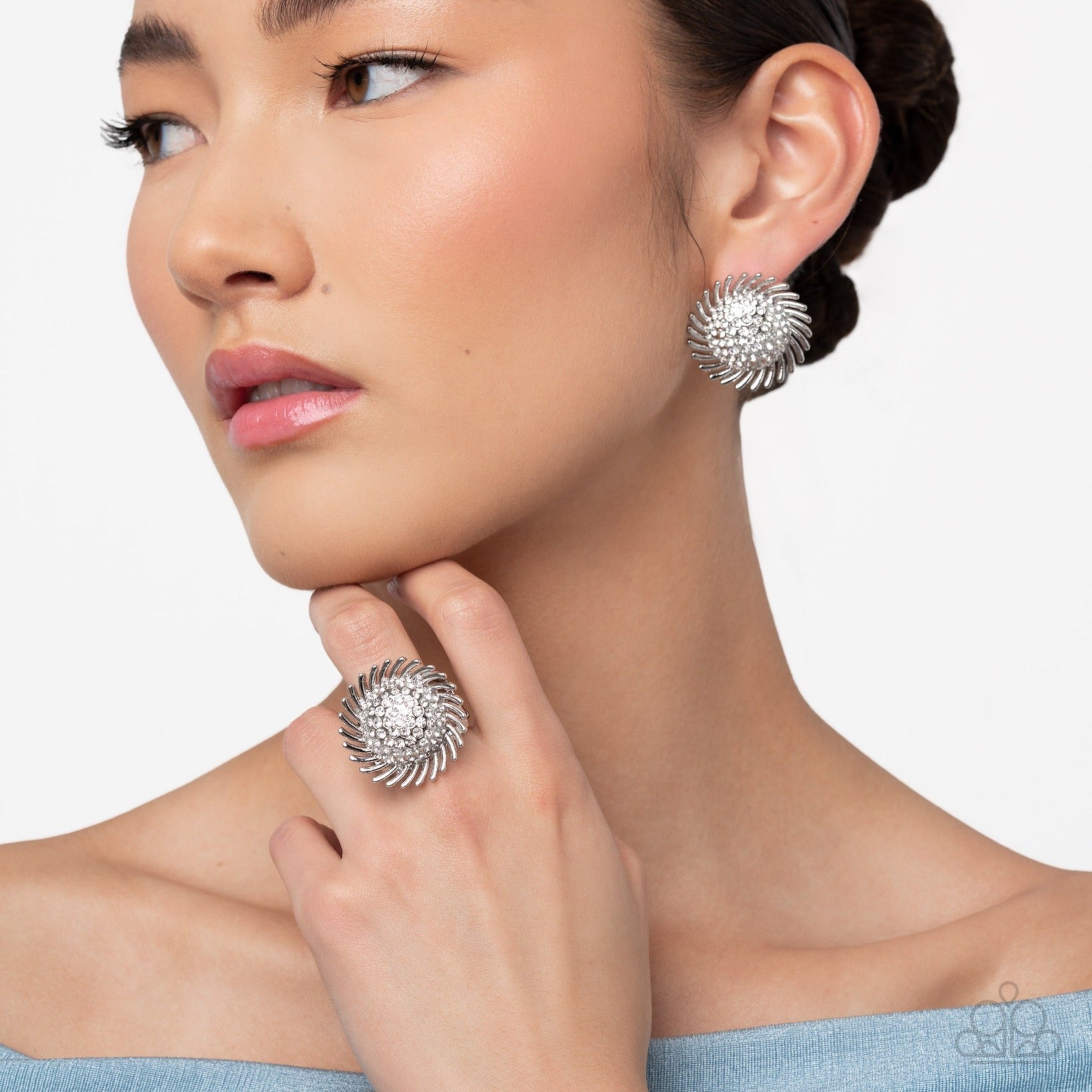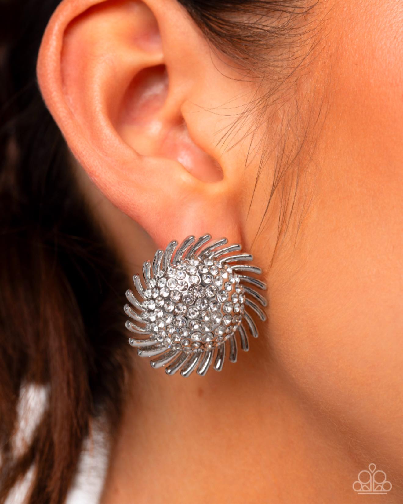 Curled bars of silver whirl out from a white rhinestone-embellished center, creating an exaggerated firework-like display at the ear. Earring attaches to a standard post fitting.