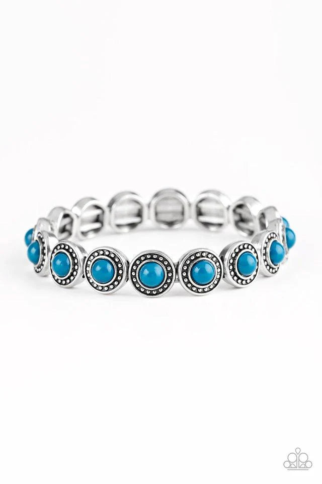 Dotted with refreshing blue beaded centers, studded silver frames are threaded along stretchy elastic bands and linked around the wrist for a whimsical look.