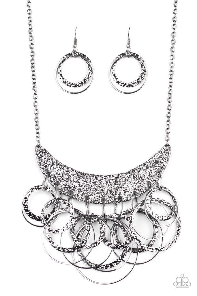 Hammered and embossed in a foil-like finish, a gunmetal moon-like frame bows below the collar. Dainty gunmetal hoops and matching hammered rings cascade from the bottom, creating an edgy fringe. Features an adjustable clasp closure.