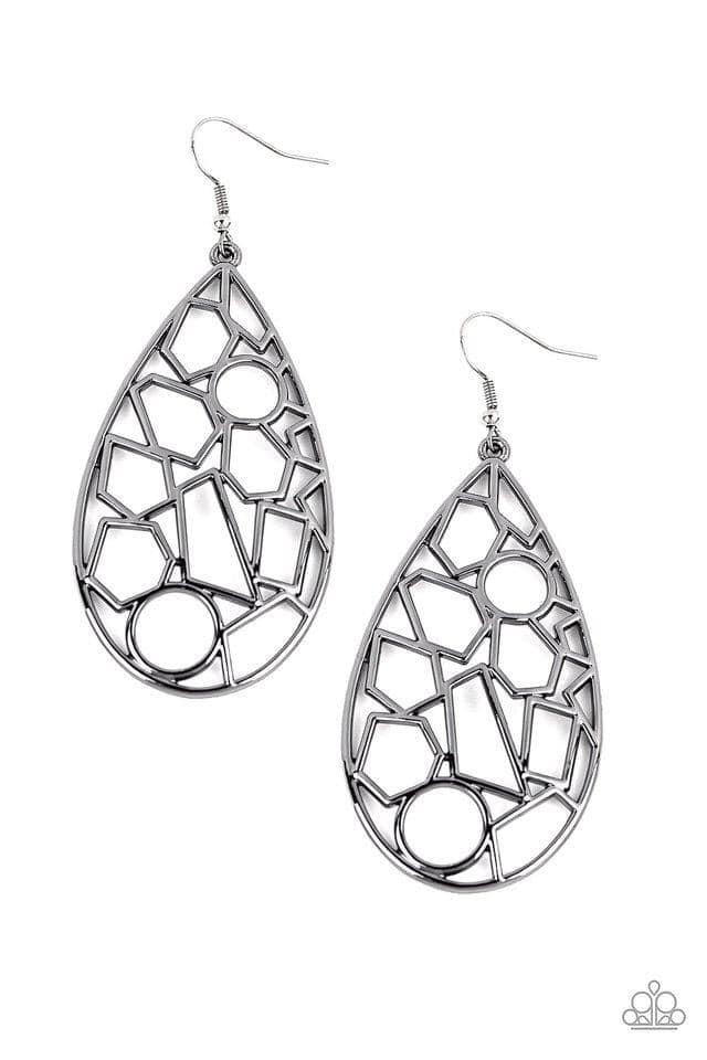 An abstract collection of airy gunmetal circles, rectangles, and trapezoidal shapes collide together, coalescing into a shattered lure. Earring attaches to a standard fishhook fitting.