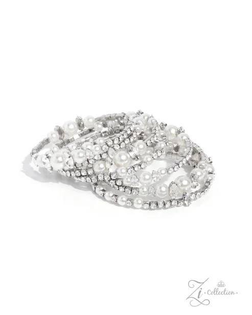 Featuring various dazzling dimensions, a collection of glossy white pearls, elevated-pronged white teardrop and marquise-cut gems, and sparkling white gems in squared silver fittings is threaded along an invisible wire that coils around the wrist. Each flick of the wrist captures a different detail, showcasing the infinity wrap’s irresistible shimmer and range of refinement.