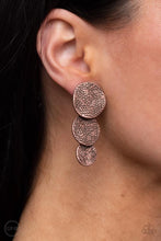 Scratched in a tactile pattern, warped copper discs decrease in size as they overlap into a rustic lure for an artisan inspired look. Earring attaches to a standard clip-on fitting.