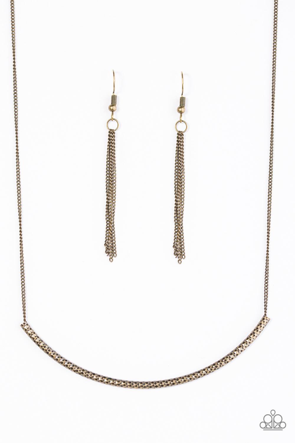 Featuring diamond-cut shimmer, a bowing brass bar dips below the collar in a fierce industrial fashion. Features an adjustable clasp closure.