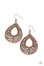 Encrusted in glittery topaz rhinestones, an teardrop silhouette is pressed into an airy copper backdrop of whimsical filigree for a casual look. Earring attaches to a standard fishhook fitting.