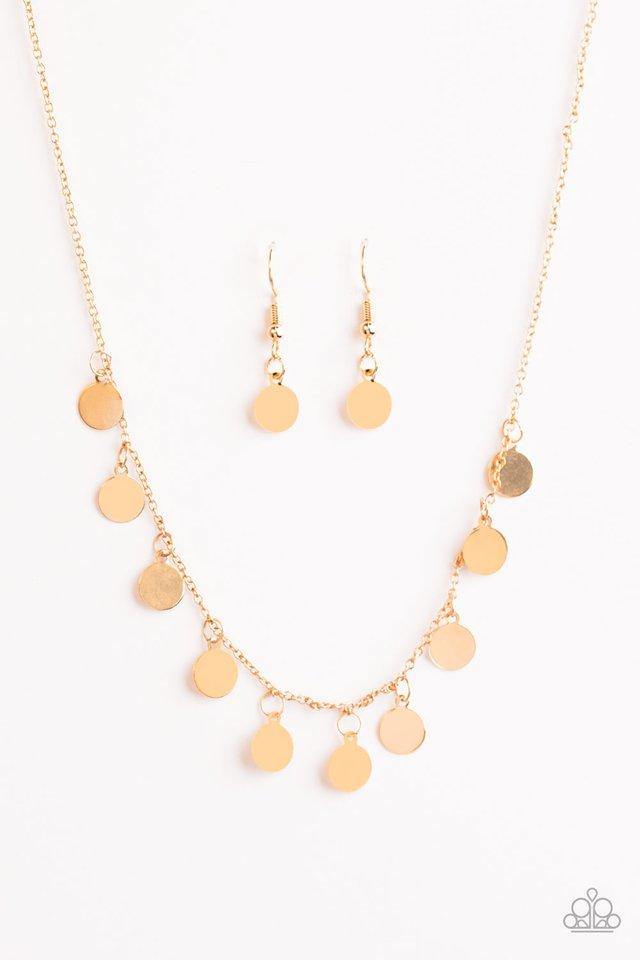 Dainty gold discs dance along a shimmery gold chain, creating blinding shimmer around the neck. Features an adjustable clasp closure.