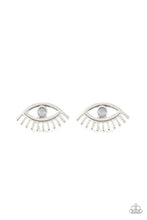 A dainty opalescent rhinestone is pressed into the center of a silver eye-shaped frame for a funky fashion. Earring attaches to a standard post fitting.