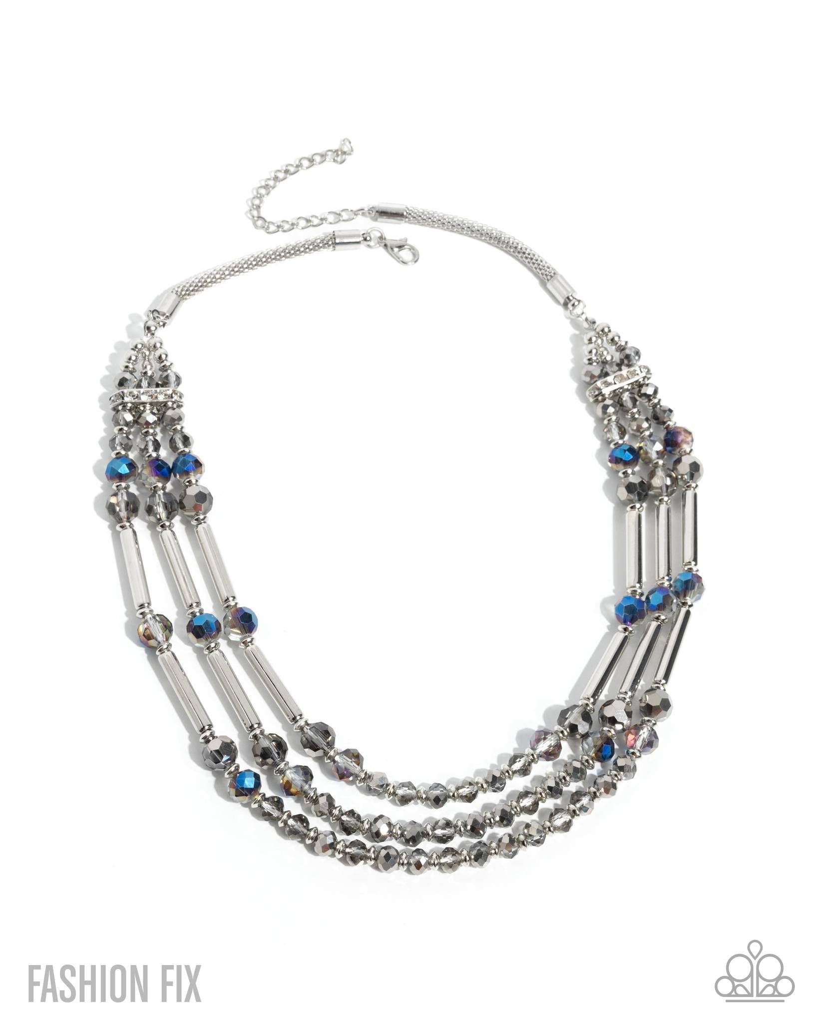 Necklace: Electric Envy - Multi - Brushed in a UV-shimmer, a seemingly flashy collection of faceted beads in varying hues, silver cylindrical beads, and silver discs stream in place along three invisible strings from a silver mesh chain, creating edgy layers across the chest. Features an adjustable clasp closure. Sold as one individual necklace. Includes one pair of matching earrings.