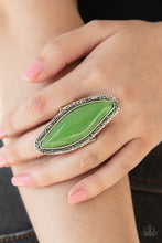 An oblong green stone is pressed into a shimmery silver frame embossed and studded in tactile filigree, creating a dramatic stone display atop the finger. Features a stretchy band for a flexible fit.