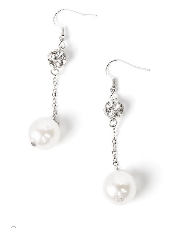 A lusciously oversized pearl is suspended from a dainty silver chain that delicately sways from a brilliant cluster of white rhinestones, making a glamorously elegant lure. Earring attaches to a standard fishhook fitting.