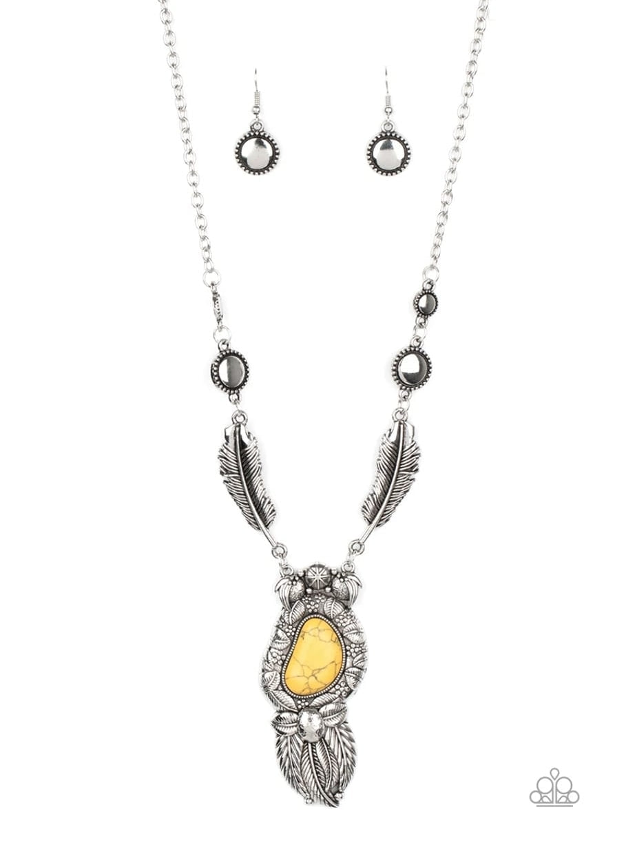 Featuring sunburst patterns, a dainty collection of silver beads connect to two silver feather frames that give way to a one-of-a-kind yellow stone pendant. Embossed in floral and leafy patterns, the sunny stone pendant gives way to a stationary fringe of overlapping silver feathers for a whimsical finish. Features an adjustable clasp closure.