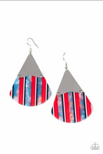 Streaked in sections of iridescent shell and red, white, and blue stripes, a wavy acrylic frame links to the bottom of a delicately hammered silver triangular plate, creating a colorful lure. Earring attaches to a standard fishhook fitting
