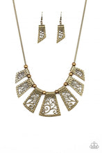 Infused with antiqued brass beads, a collection of hammered brass frames filled with vine-like filigree slide along a sleek brass chain below the collar for a statement-making finish. Features an adjustable clasp closure.