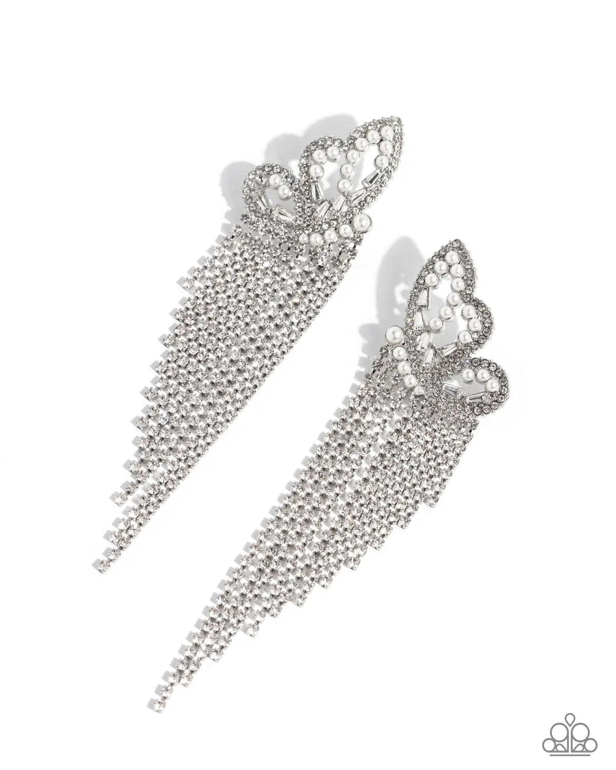 Glassy white rhinestones, dainty white pearls, and white emerald-cut gems are encrusted along the front of an airy silver butterfly frame, creating a whimsical centerpiece. Staggered rows of white rhinestones pressed in delicate silver square fittings cascade from the sparkly centerpiece, seemingly lifting the butterfly off to its glitzy flight. Earring attaches to a standard post fitting.