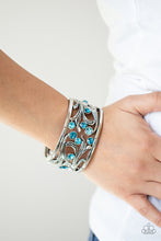 An ombre of blue rhinestones scatters across an airy floral frame among vine-like filigree. The romantically whimsical frames are threaded along stretchy bands and repeat around the wrist for an enchanting display.